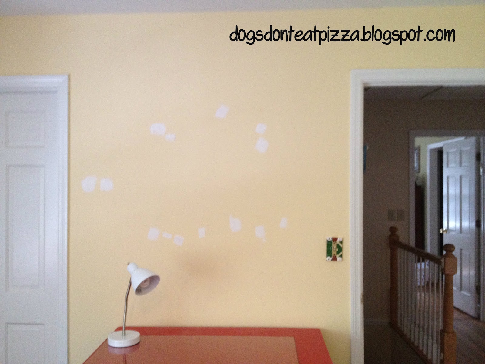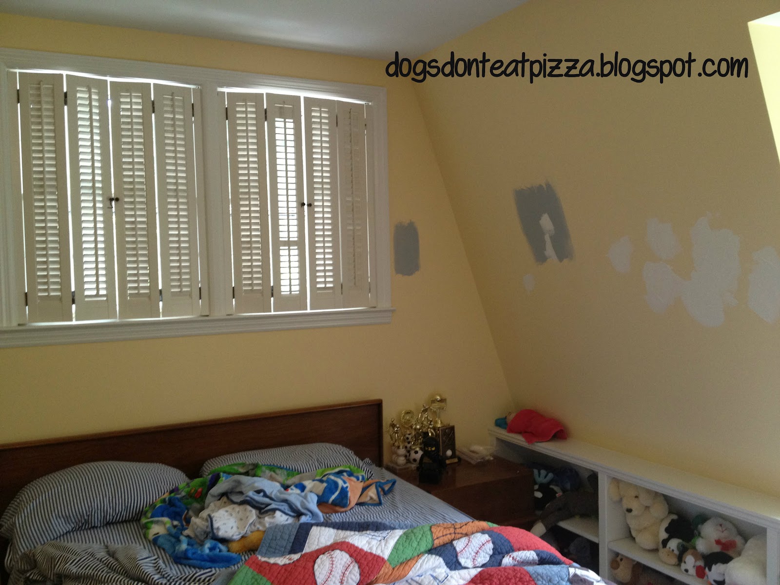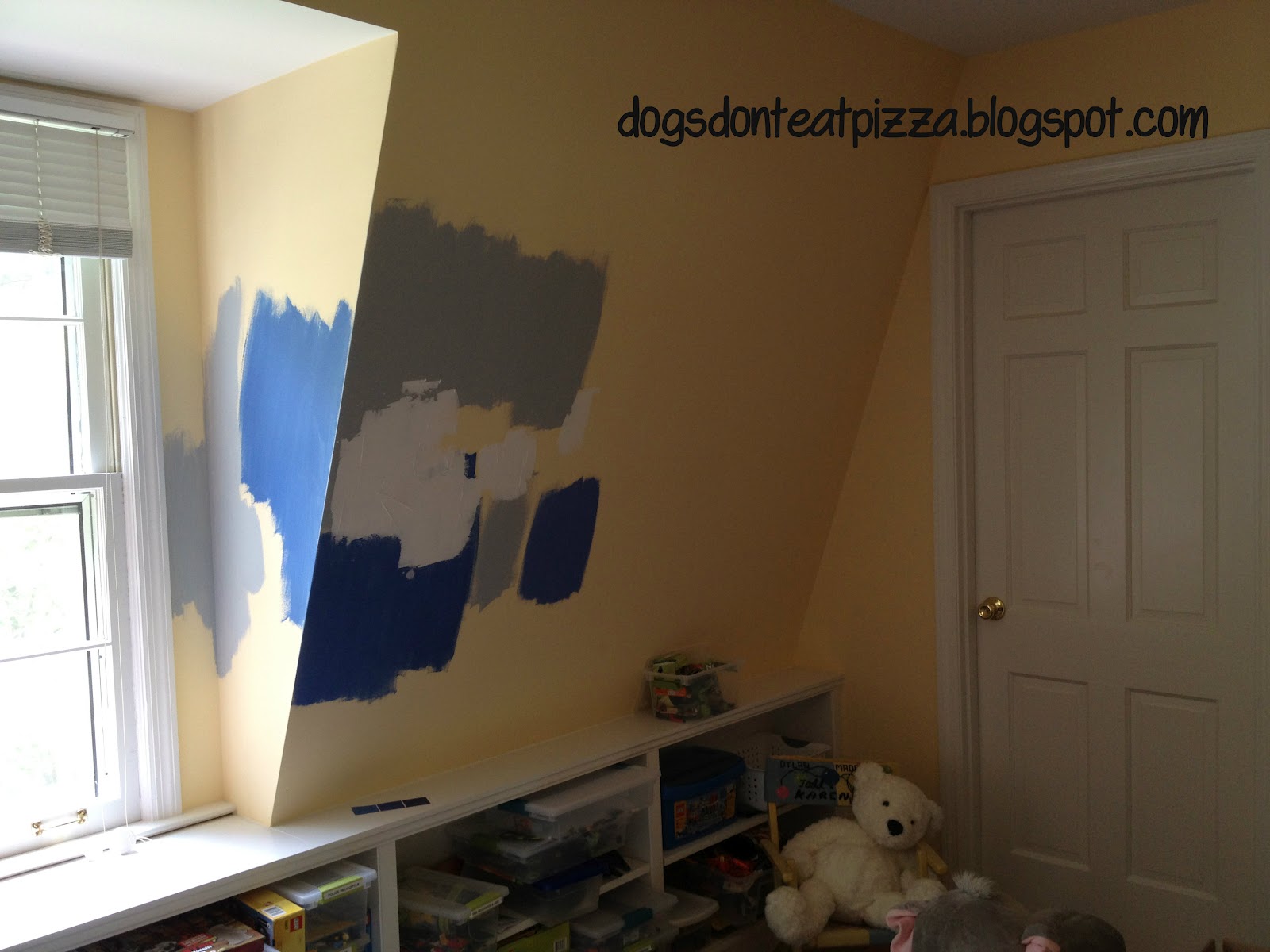 Sorry for the crappy iPhone picture, but that was all I had handy. Note the different colors tested out on the wall. The light grayish blue one is Blue Springs.