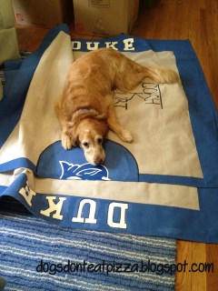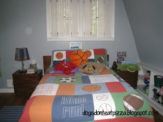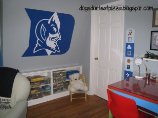 Here are the curtains again.  I still love them.  Also, the chair is his rocking chair from when D was a baby, and on the back of it is a Duke blanket that my good friend Cynthia gave me as a wedding gift (does she know me or what?).