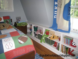 I love that D’s room has a ton of shelves for storage.  I put his Legos on the shelves (all in labeled clear plastic boxes), his books, his stuffed animals, and some bins.  The green bucket holds tickets from football games and other events.  The green and blue bins hold small toys and his “creations” – art and bookmarks and other stuff that he made.  The buckets came from Target and the bins came from Home Goods.