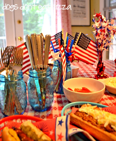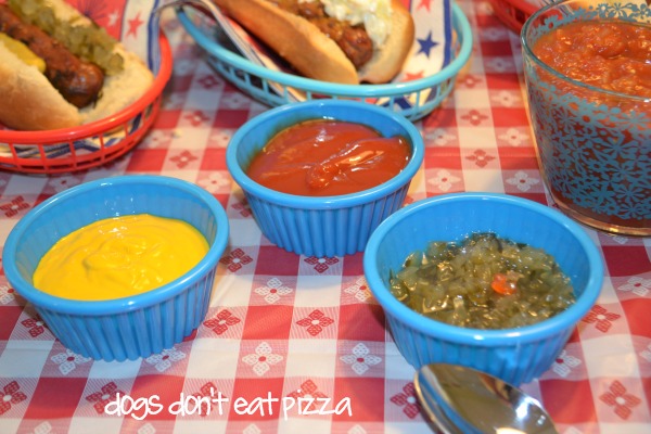 The flags were 3 for $1 and I bought six. The tablecloth, the napkins, the basket for the hot dog buns, the basket for the chips, and the ramekins with the condiments also came from the dollar store. Total cost: $5.