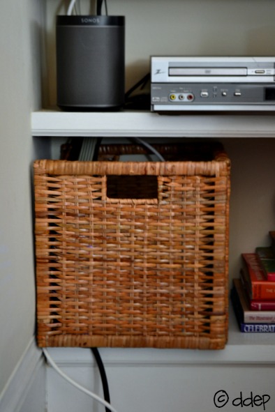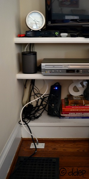 We have beautiful built-in shelves in our living room, and our TV rests on one of them. With a TV comes cords: cable cord, power cord, cord to the DVR box, plus a power strip.