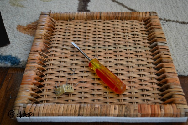 What you’re going to do is create a three-sided basket. To do this, remove the tabs for one side of the basket. Use the flat-head screwdriver to pry up the tabs and staples. This isn’t hard to do, I promise. You’ll end up removing four tabs – two on each side of that side of the basket.