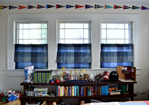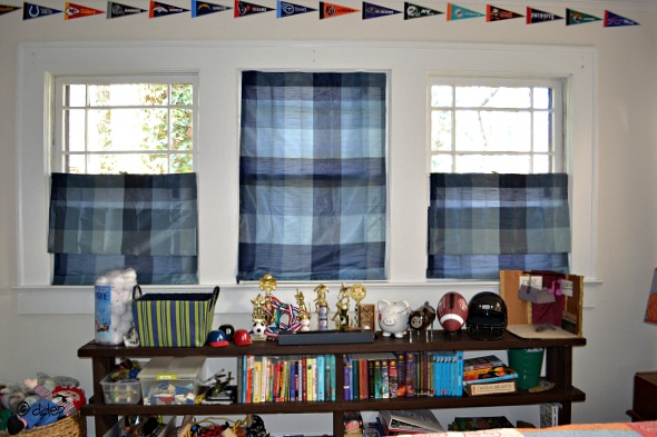 The other problem in his room was that it was dark. The curtains, which hung to the floor, just sucked the light out of the room. He has six big windows – no point in hiding them. Look at the difference: