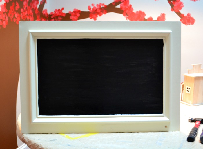Once the paint dries, let it cure for two or three days before using it. Once it’s cured, then you want to condition it by rubbing a piece of chalk all over it and then erasing. That makes it an official chalkboard – or, well, at least easier to write on and erase. In fact, every time you clean it with water or cleaner (not just erase it), you’ll want to re-condition it by rubbing chalk on it.