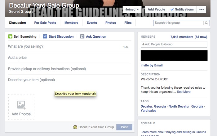 - Price competitively. Keep in mind that this is a yard sale group – you aren’t going to get top resale value for it; you’ll get a little more than what someone would pay if they happened upon the piece at a yard sale. If you can give a reason for your pricing (for example: price is half of what you paid for it, or it’s new and you just want to get your money back), so much the better.