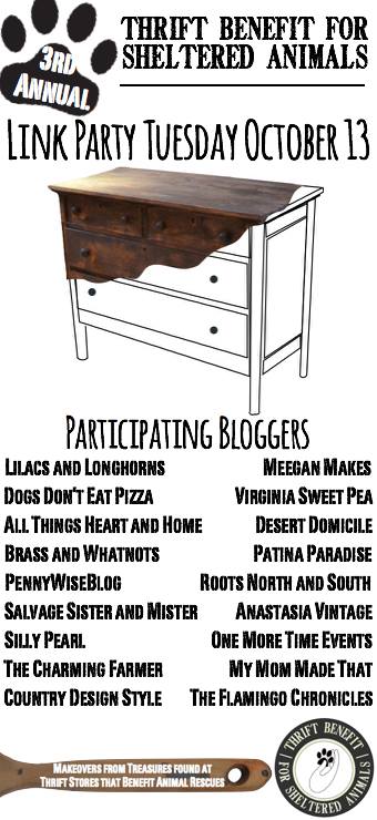 This is the third year I’ve participated in the Thrift Benefit for Sheltered Animals. Here’s how it works: The wonderful Jeanette of the blog Country Design Style gets a bunch of animal-loving DIY and home bloggers together. We each go to a thrift store whose sales benefit animal rescue and we buy something to transform. Then, we transform the piece and show you the finished product.