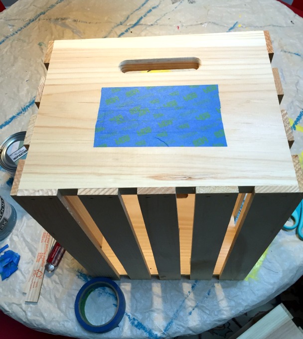 Taped off area of crate for chalkboard paint label - Personalized Hanukkah Gift Crate - thediybungalow.com